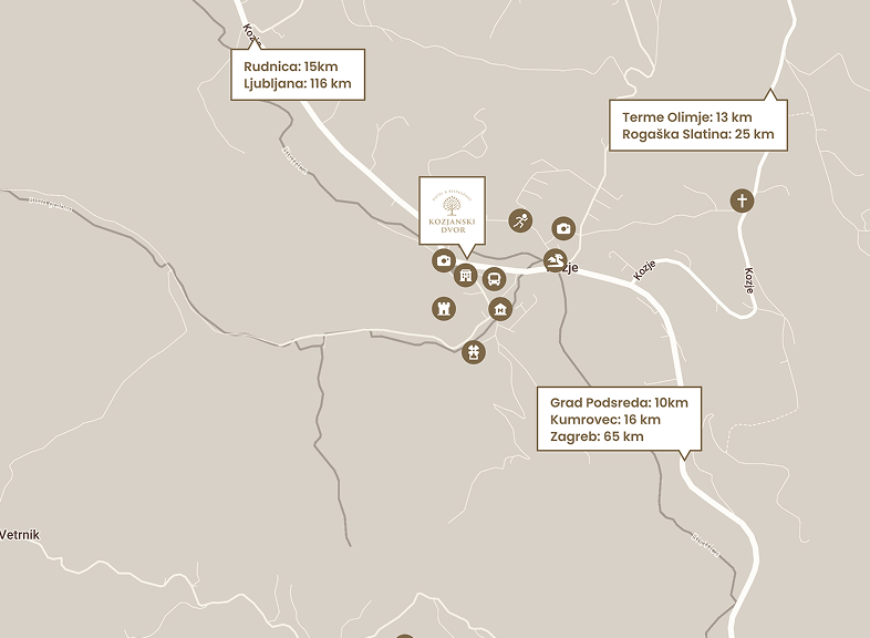 Kozjanski dvor si trova tra le colline del Parco Regionale di Kozjansko, dove la natura incontaminata incontra il ricco patrimonio culturale. Nelle vicinanze potete scoprire il Castello di Podsreda, salire sul Vetrnik dove l’arpa eolica vi incanterà con la sua melodia, oppure visitare le vicine Terme Olimia.